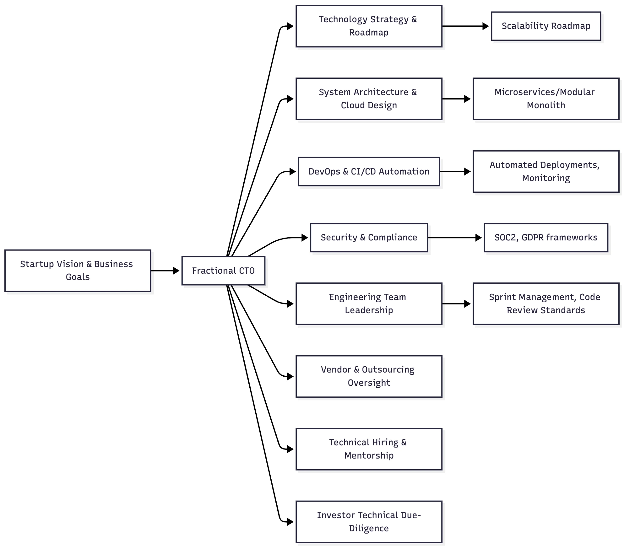 A Fractional CTO is a senior technology executive engaged on a part-time, advisory, or project-based basis to drive technology strategy, architecture direction, and engineering excellence. Rather than hiring a full-time CTO, startups leverage a fractional CTO to design scalable product infrastructure, evaluate technology choices, establish engineering processes, and ensure the product roadmap aligns with business growth and investment milestones.